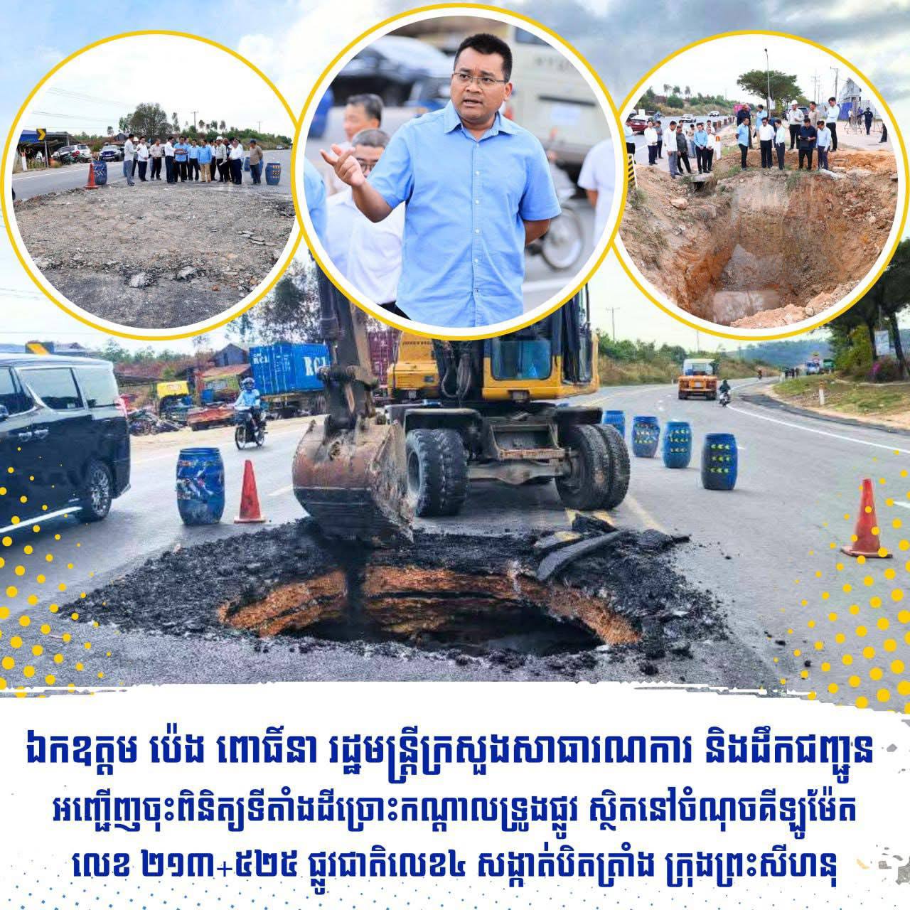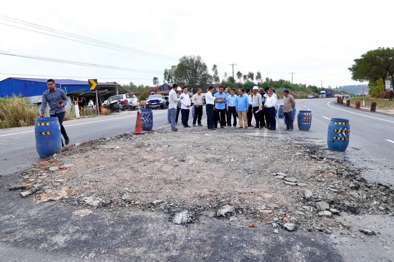 (ព្រះសីហនុ)៖ លោក ប៉េង ពោធិ៍នា រដ្ឋមន្រ្តីក្រសួងសាធារណការ និងដឹកជញ្ជូន នារសៀលថ្ងៃទី៦ ខែមករា ឆ្នាំ២០២៦ បានអញ្ជើញចុះពិនិត្យទីតាំងដីច្រោះកណ្តាលទ្រូងផ្លូវ ស្ថិតនៅចំណុចគីឡូម៉ែតលេខ ២១៣+៥២៥ ផ្លូវជាតិលេខ៤ សង្កាត់បិតត្រាំង ក្រុងព្រះសីហនុ ដោយមានការចូលរួមពីថ្នាក់ដឹកនាំក្រសួង និងក្រុមការងារបច្ចេកទេសជាច្រើនរូបទៀត។