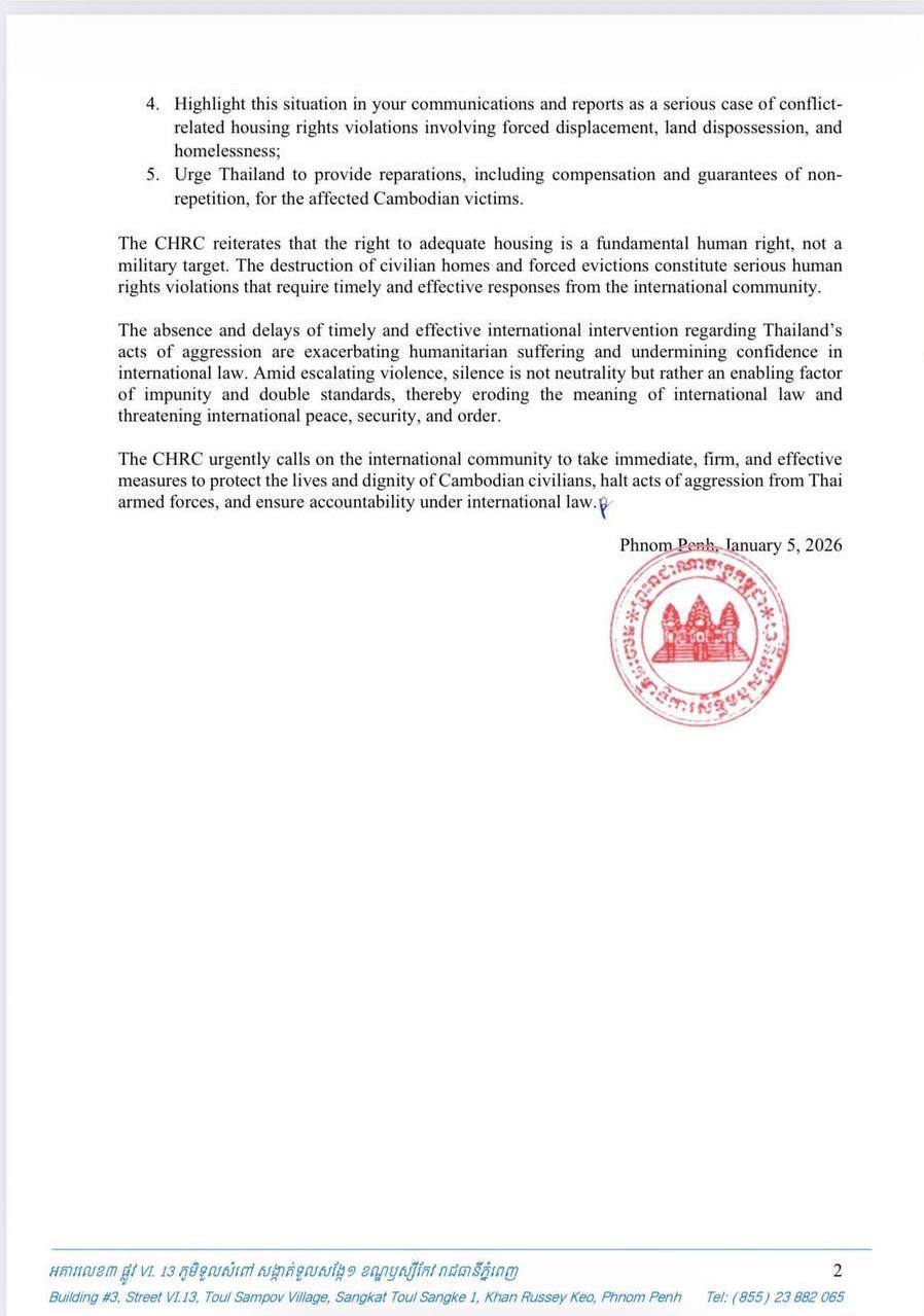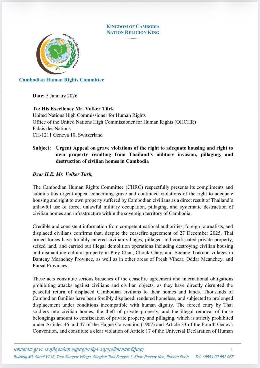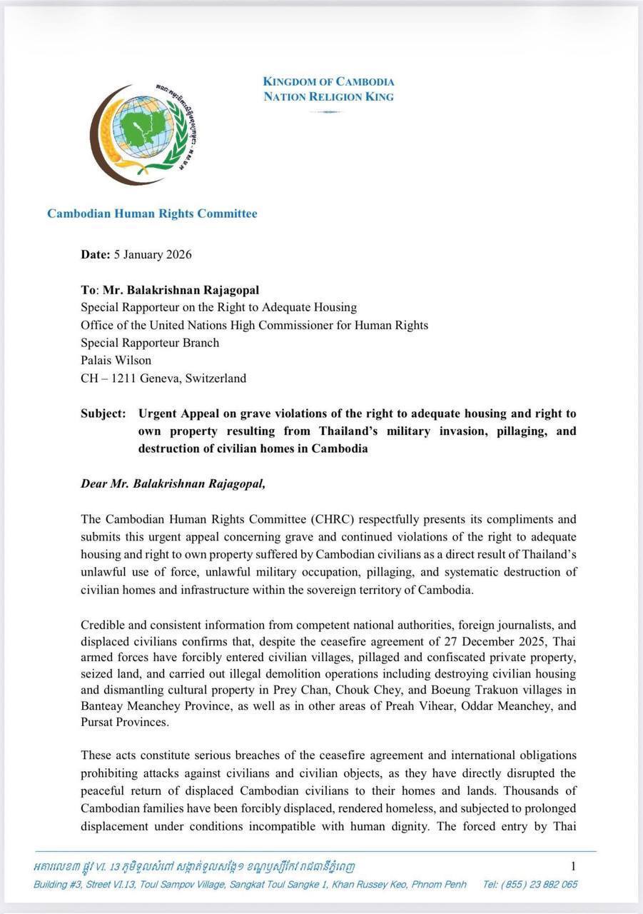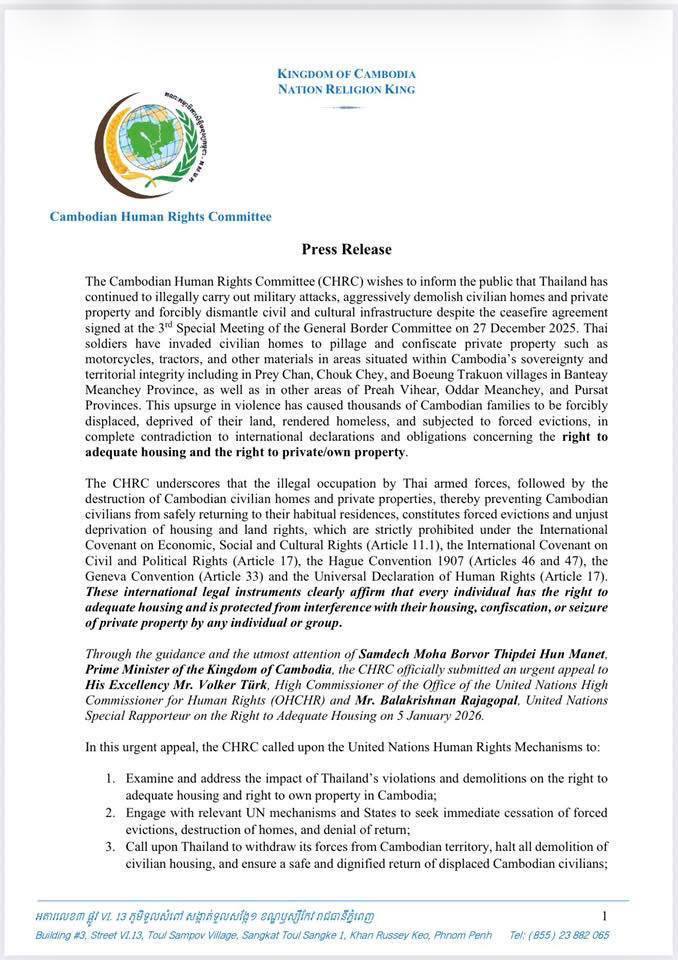 (ភ្នំពេញ)៖ គណៈកម្មាធិការសិទ្ធិមនុស្សកម្ពុជា នៅថ្ងៃទី៥ ខែមករា ឆ្នាំ២០២៦ បានដាក់ពាក្យបណ្តឹងទៅកាន់ឧត្តមស្នងការ នៃការិយាល័យឧត្តមស្នងការអង្គការសហប្រជាជាតិ ទទួលបន្ទុកសិទ្ធិមនុស្ស ទាមទារឱ្យចាត់វិធានការយ៉ាងឆាប់រហ័ស និងម៉ឺងម៉ាត់ ចំពោះការរំលោភសិទ្ធិមានលំនៅឋាន និងសិទ្ធិកាន់កាប់ទ្រព្យសម្បត្តិឯកជន របស់ប្រជាពលរដ្ឋកម្ពុជា ដែលបង្កឡើងដោយអំពើឈ្លានពាន ការបំផ្លិចបំផ្លាញផ្ទះសម្បែង ការលួចយកទ្រព្យសម្បត្តិ និងការបណ្តេញចេញដោយបង្ខំពីកងកម្លាំងយោធាថៃ។ នេះបើតាមសេចក្តីប្រកាសព័ត៌មានដែលបណ្តាញព័ត៌មាន Fresh News ទទួលបាន។