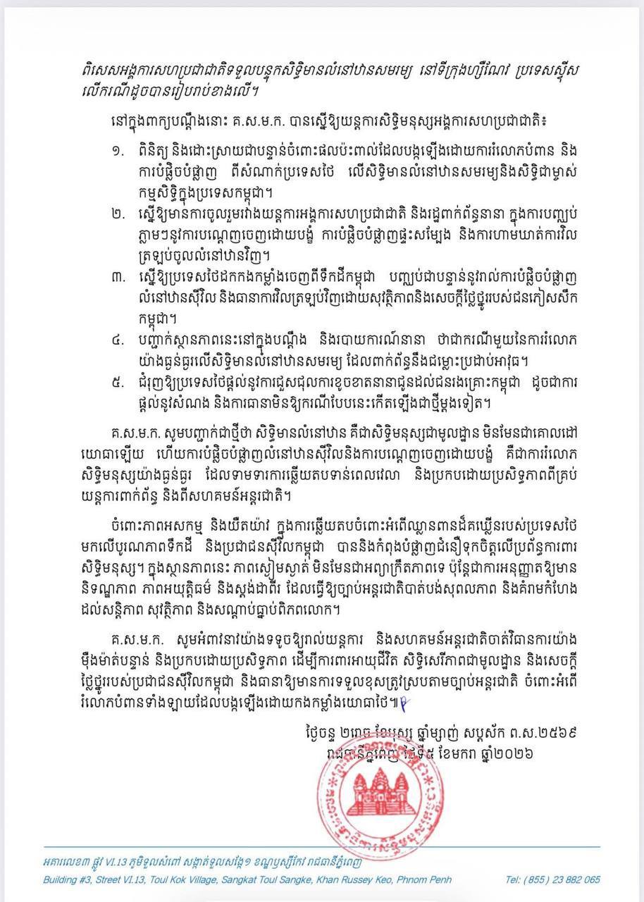 គណៈកម្មាធិការសិទ្ធិមនុស្សកម្ពុជា បានលើកឡើងថា ទោះបីជាមានកិច្ចព្រមព្រៀងបទឈប់បាញ់ ដែលត្រូវបានចុះហត្ថលេខា នៅក្នុងកិច្ចប្រជុំពិសេសលើកទី៣ នៃគណៈកម្មាធិការព្រំដែនទូទៅនាថ្ងៃទី២៧ ខែធ្នូ ឆ្នាំ២០២៥ យ៉ាងណាក៏ដោយ ក៏ប្រទេសថៃបានបន្តប្រើប្រាស់កម្លាំងយោធាដោយខុសច្បាប់ បង្កើនសកម្មភាពបំផ្លិចបំផ្លាញផ្ទះសម្បែង ទ្រព្យសម្បត្តិ និងហេដ្ឋារចនាសម្ព័ន្ធស៊ីវិលនិងវប្បធម៌។