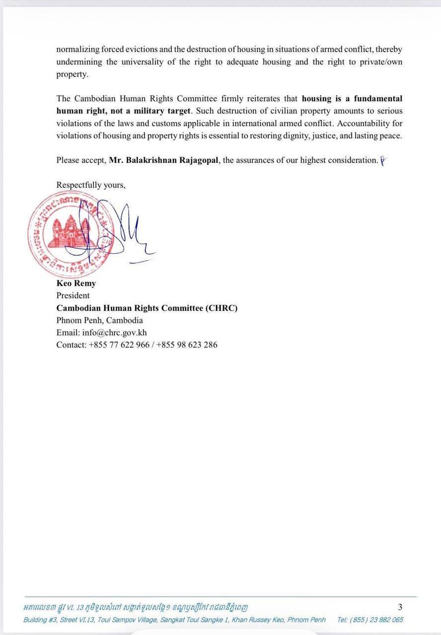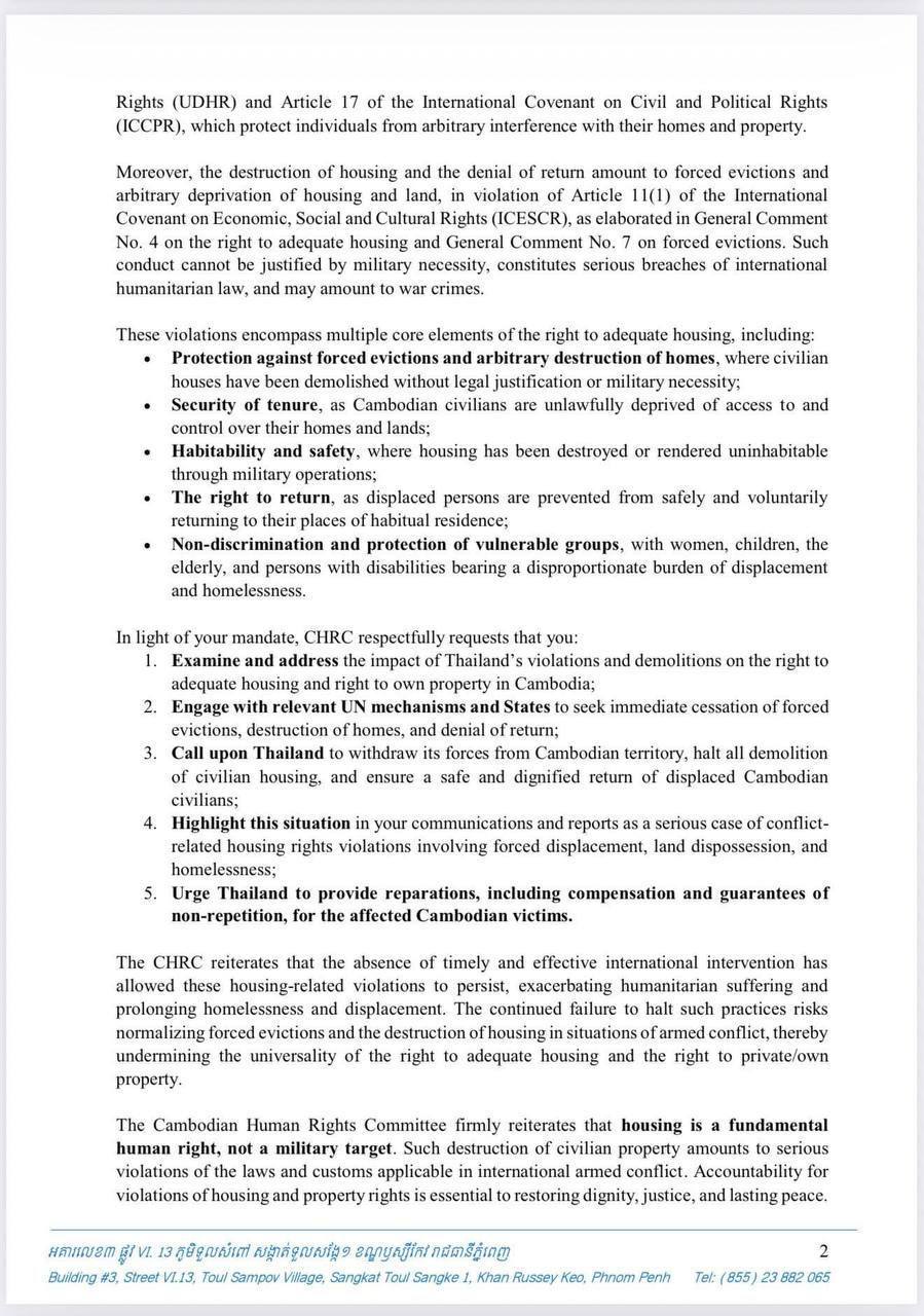 គណៈកម្មាធិការសិទ្ធិមនុស្សកម្ពុជា បញ្ជាក់ទៀតថា សិទ្ធិមានលំនៅឋាន គឺជាសិទ្ធិមនុស្សជាមូលដ្ឋាន មិនមែនជាគោលដៅ យោធាឡើយ ហើយការបំផ្លិចបំផ្លាញលំនៅឋានស៊ីវិល និងការបណ្តេញចេញដោយបង្ខំ គឺជាការរំលោភ សិទ្ធិមនុស្សយ៉ាងធ្ងន់ធ្ងរ ដែលទាមទារការឆ្លើយតបទាន់ពេលវេលា និងប្រកបដោយប្រសិទ្ធភាពពីគ្រប់ យន្តការពាក់ព័ន្ធ និងពីសហគមន៍អន្តរជាតិ។ ចំពោះភាពអសកម្ម និងយឺតយ៉ាវ ក្នុងការឆ្លើយតបចំពោះអំពើឈ្លានពានដ៏គឃ្លីនរបស់ប្រទេសថៃ មកលើបូរណភាពទឹកដី និងប្រជាជនស៊ីវីលកម្ពុជា បាននិងកំពុងបំផ្លាញជំនឿទុកចិត្តលើប្រព័ន្ធការពារ សិទ្ធិមនុស្ស។ ក្នុងស្ថានភាពនេះ ភាពស្ងៀមស្ងាត់ មិនមែនជាអព្យាក្រឹតភាពទេ ប៉ុន្តែជាការអនុញ្ញាតឱ្យមាន និទណ្ឌភាព ភាពអយុត្តិធម៌ និងស្តង់ដាពីរ ដែលធ្វើឱ្យច្បាប់អន្តរជាតិបាត់បង់សុពលភាព និងគំរាមកំហែង ដល់សន្តិភាព សុវត្ថិភាព និងសណ្តាប់ធ្នាប់ពិភពលោក។